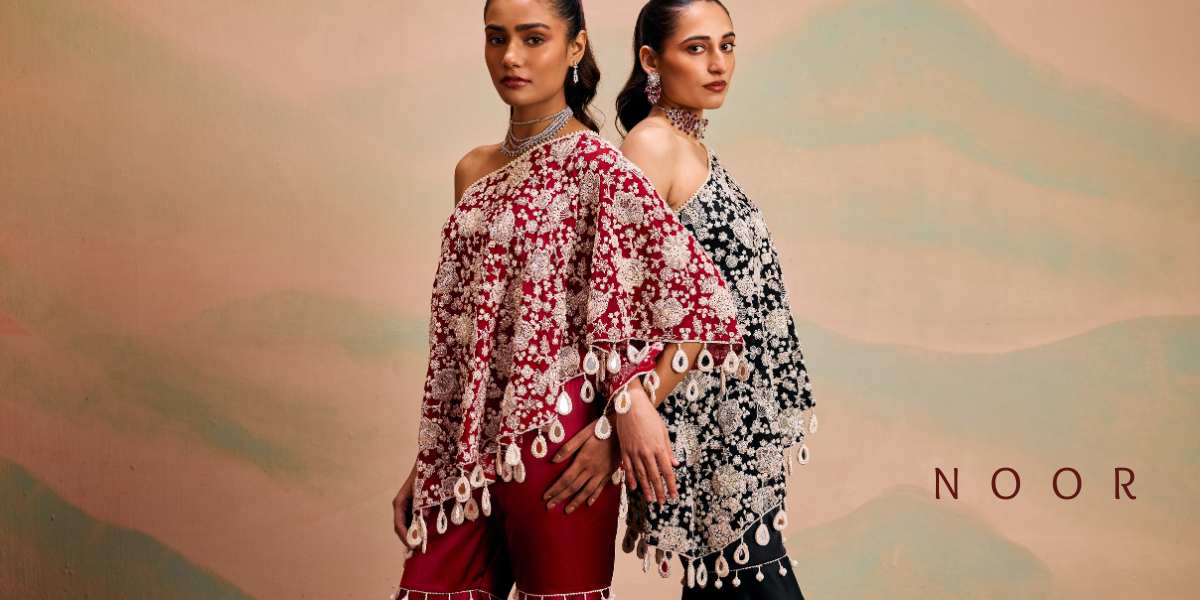 RED PEARL WORK OFF SHOULDER CAPE SET