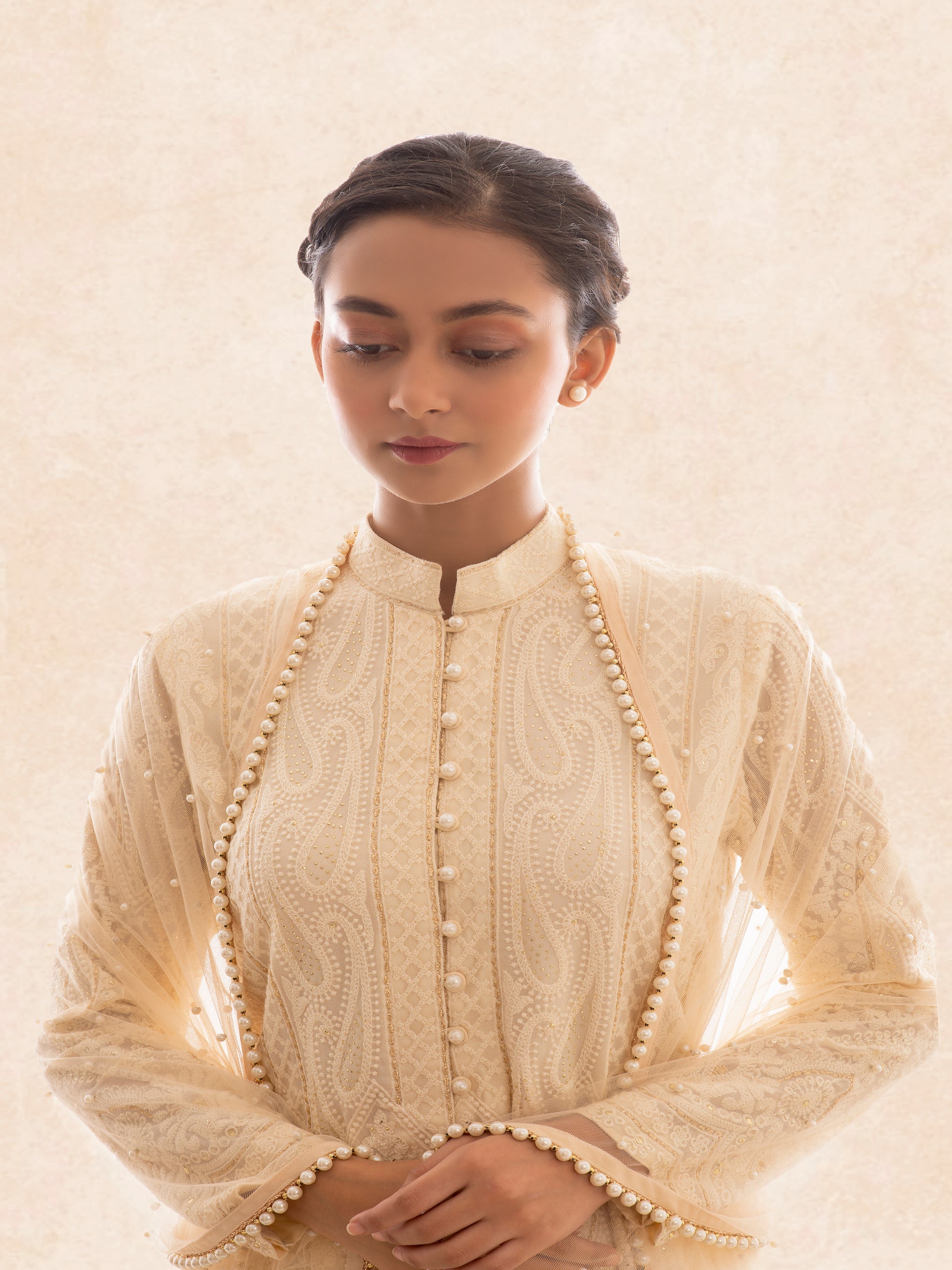 BEIGE CHIKANKARI FRILL SHARARA SET